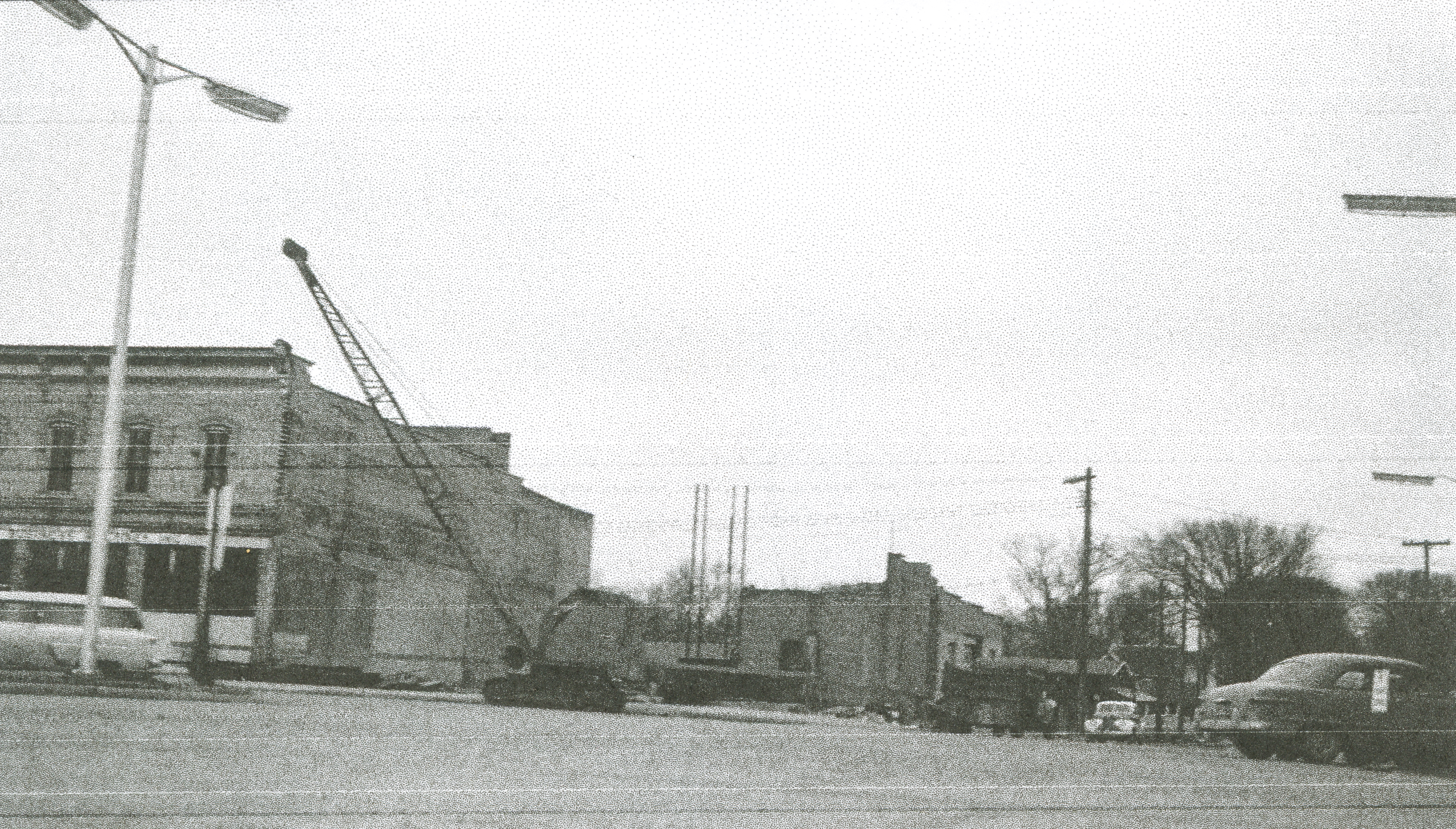 The demolition of the building at 926-928 West Exchange Street in Brodhead, Wisconsin. The building was removed to make way for a new telephone exchange building.
