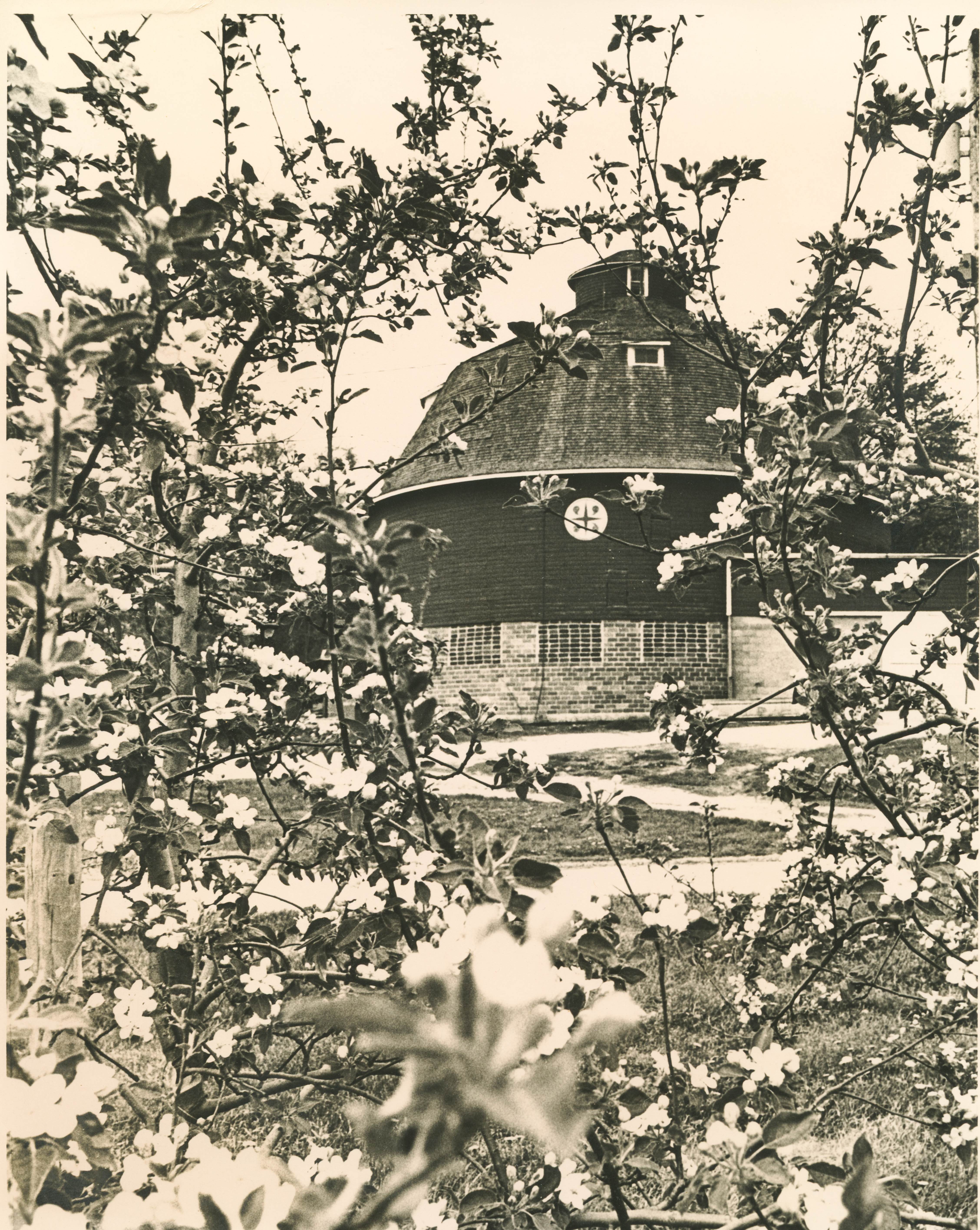 TenEyck's round barn at W968 Hwy. 11-81 Brodhead, Wisconsin, as seen through apple tree blossoms. The barn is two miles southwest of Brodhead. Jacob and Rachel TenEyck settled here in 1839. The barn was built by third generation Albert M. TenEyck in 1922. It was built from oak lumber cut from the property. It is 60 feet in diameter with a silo in the middle.