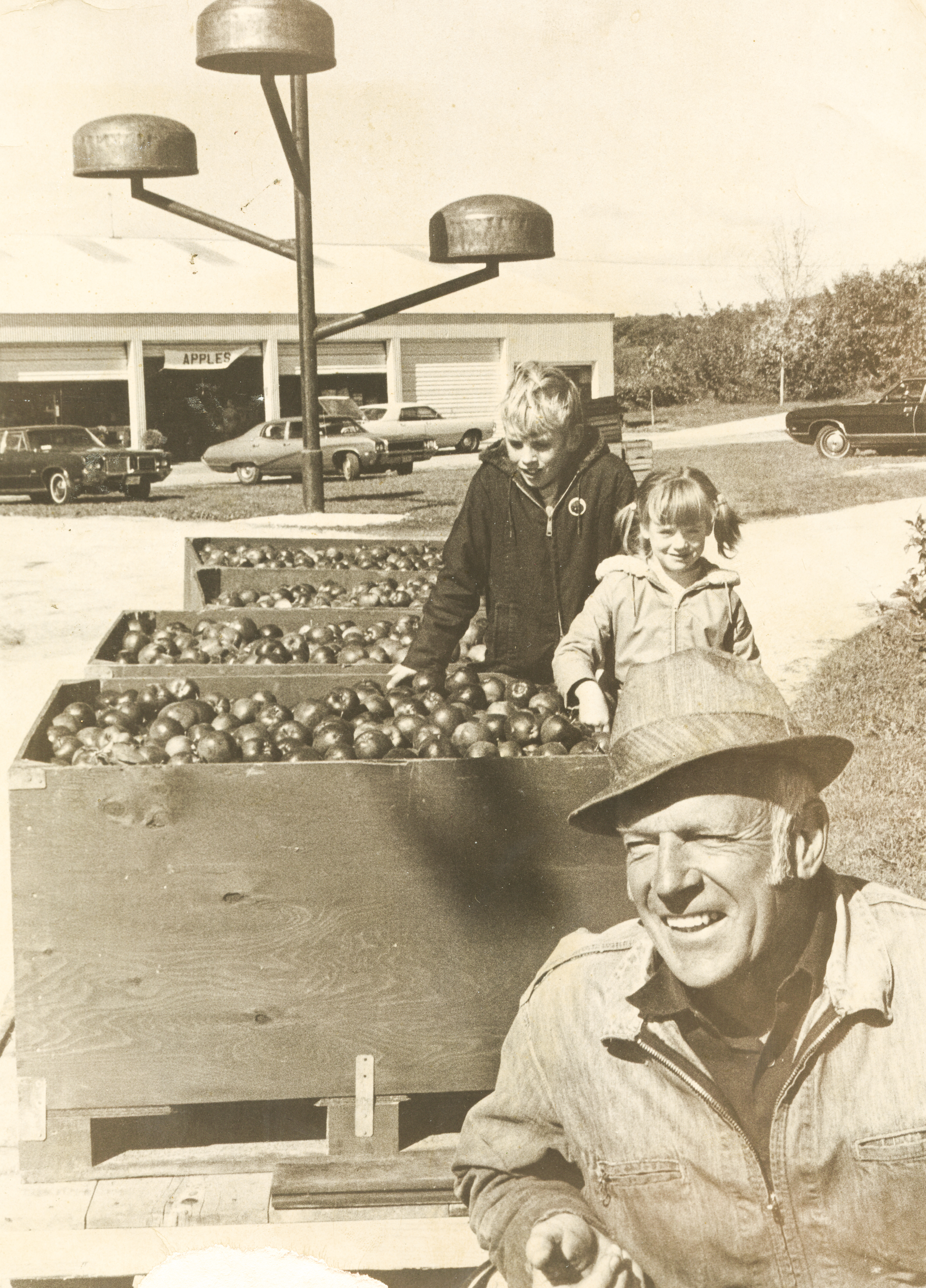 A.A. (Bob) TenEyck on his apple orchard farm with some of the harvest. Children are unknown.