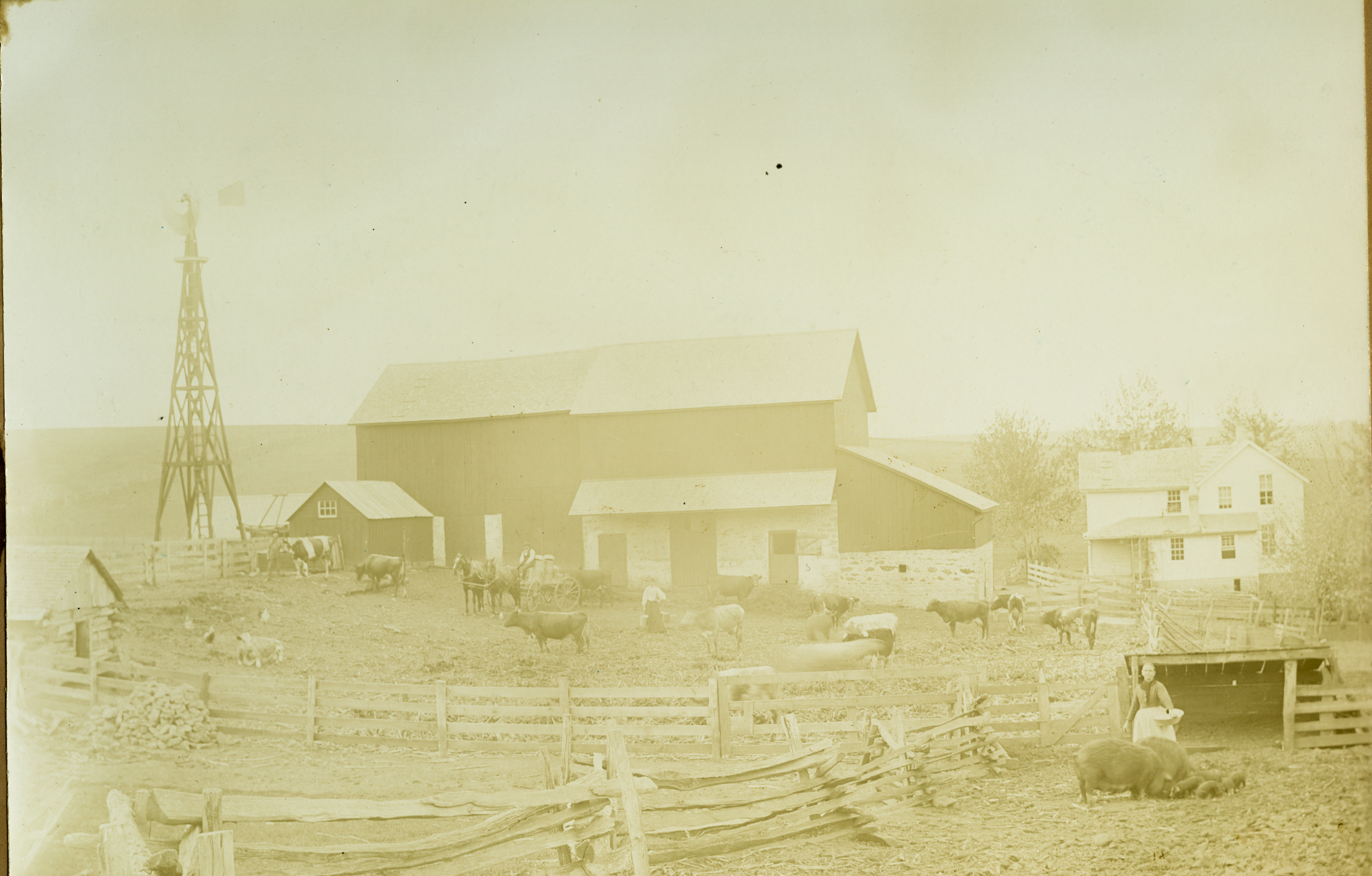 The Heinrich Schneider Farm. Woman feeding pigs at bottom right is unknown.