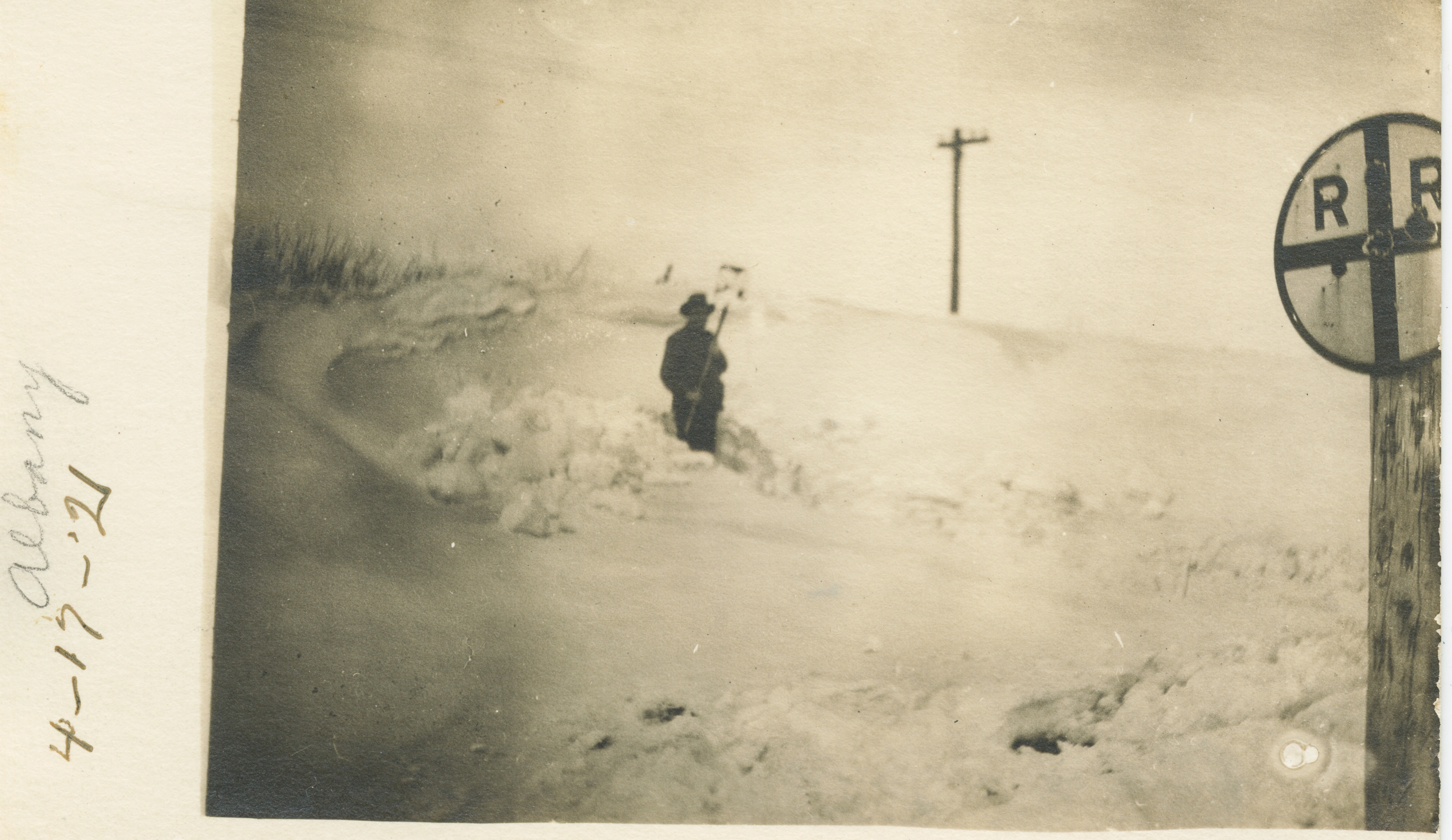 An April Blizzard. This photo was taken at Albany, Wisconsin. People were stranded for days. Roads had five foot drifts. The Milwaukee Road trains were even stalled.