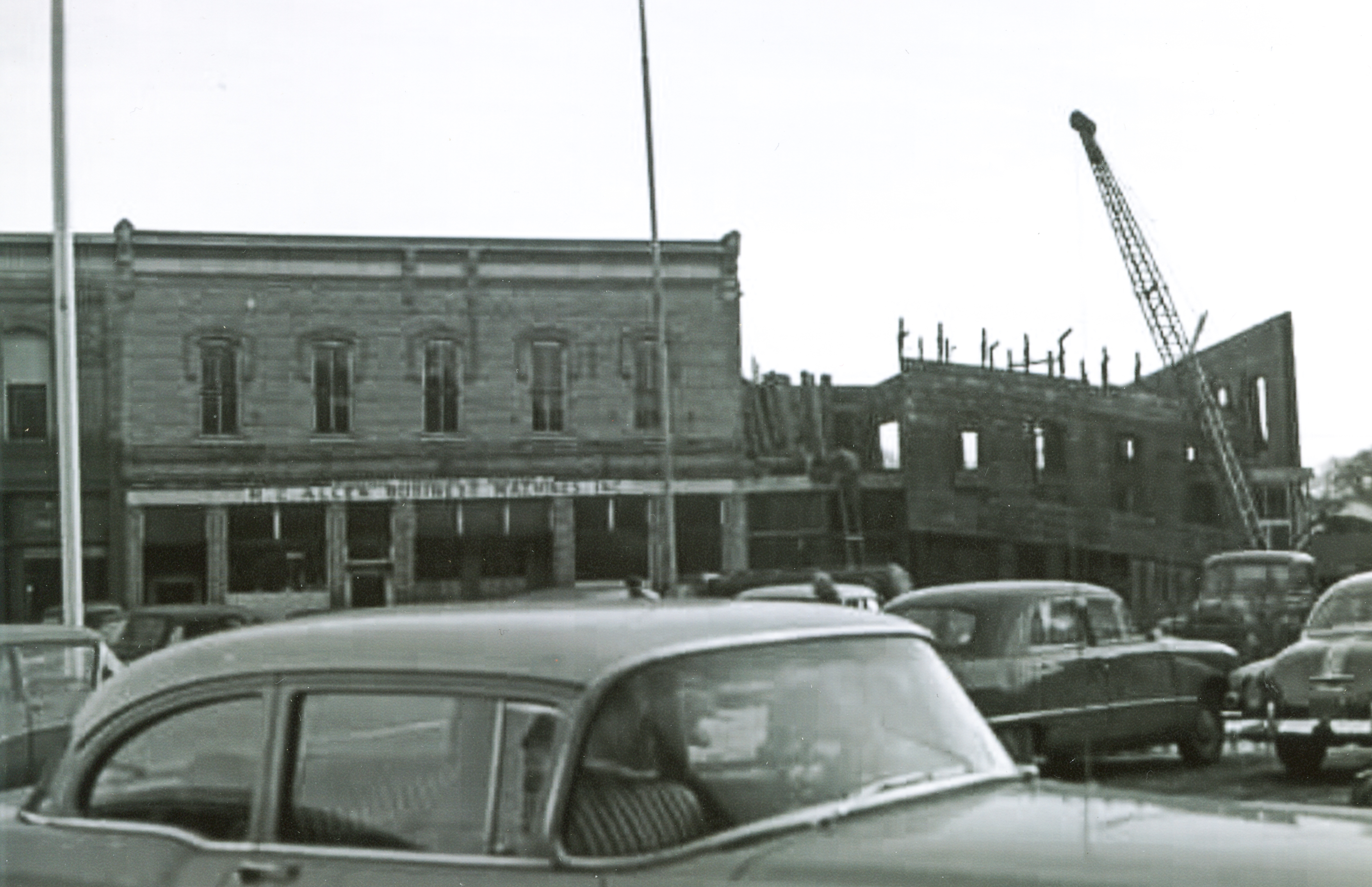 The demolition of the building at 926-928 West Exchange Street in Brodhead Wisconsin. The building was removed to make way for a new telephone exchange building. The business at left is R.C. Allen Business Machines Inc.