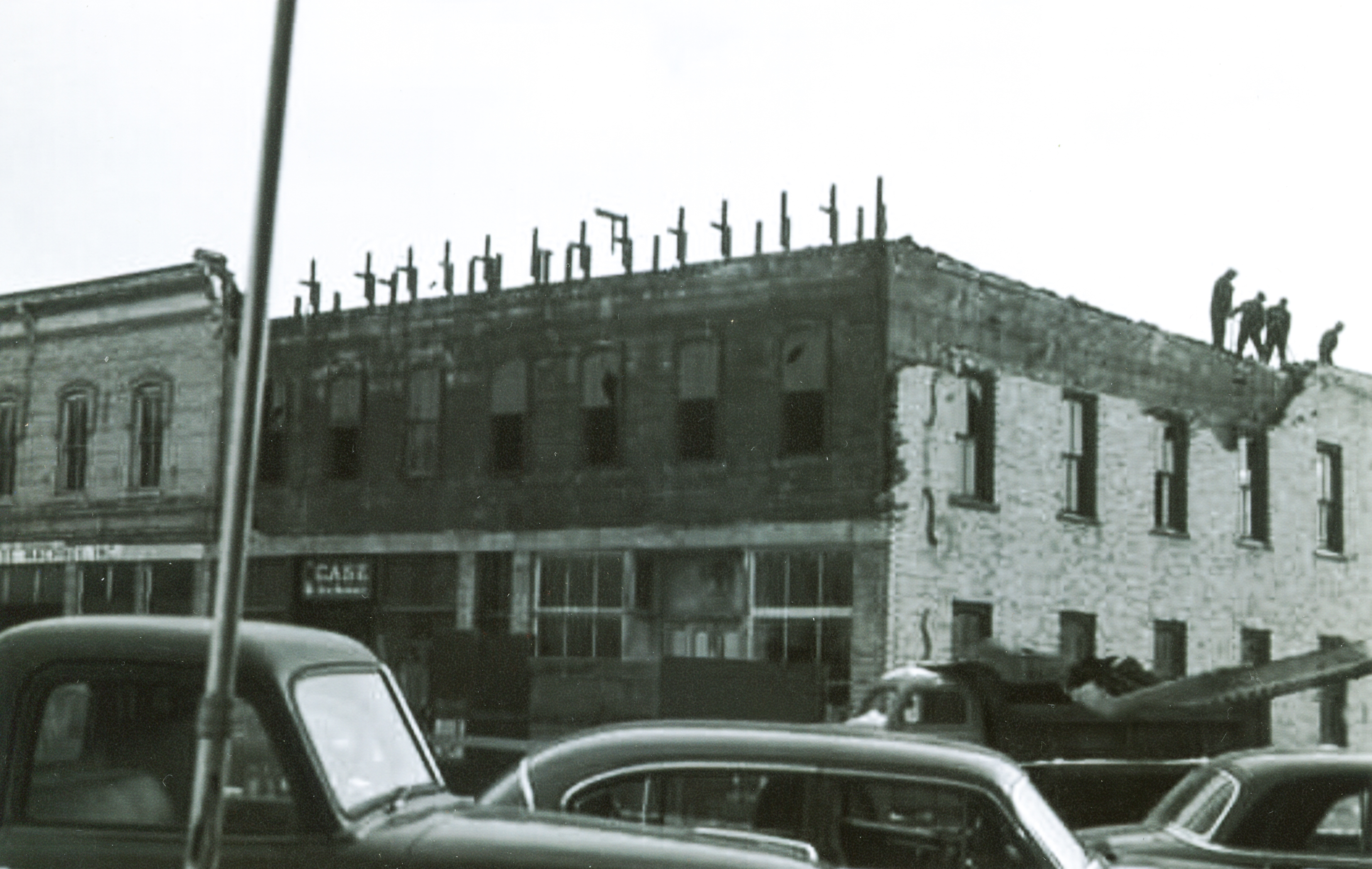 The demolition of the building at 926-928 West Exchange Street in Brodhead, Wisconsin. The building was removed to make way for a new telephone exchange building. The building had housed Case implements.