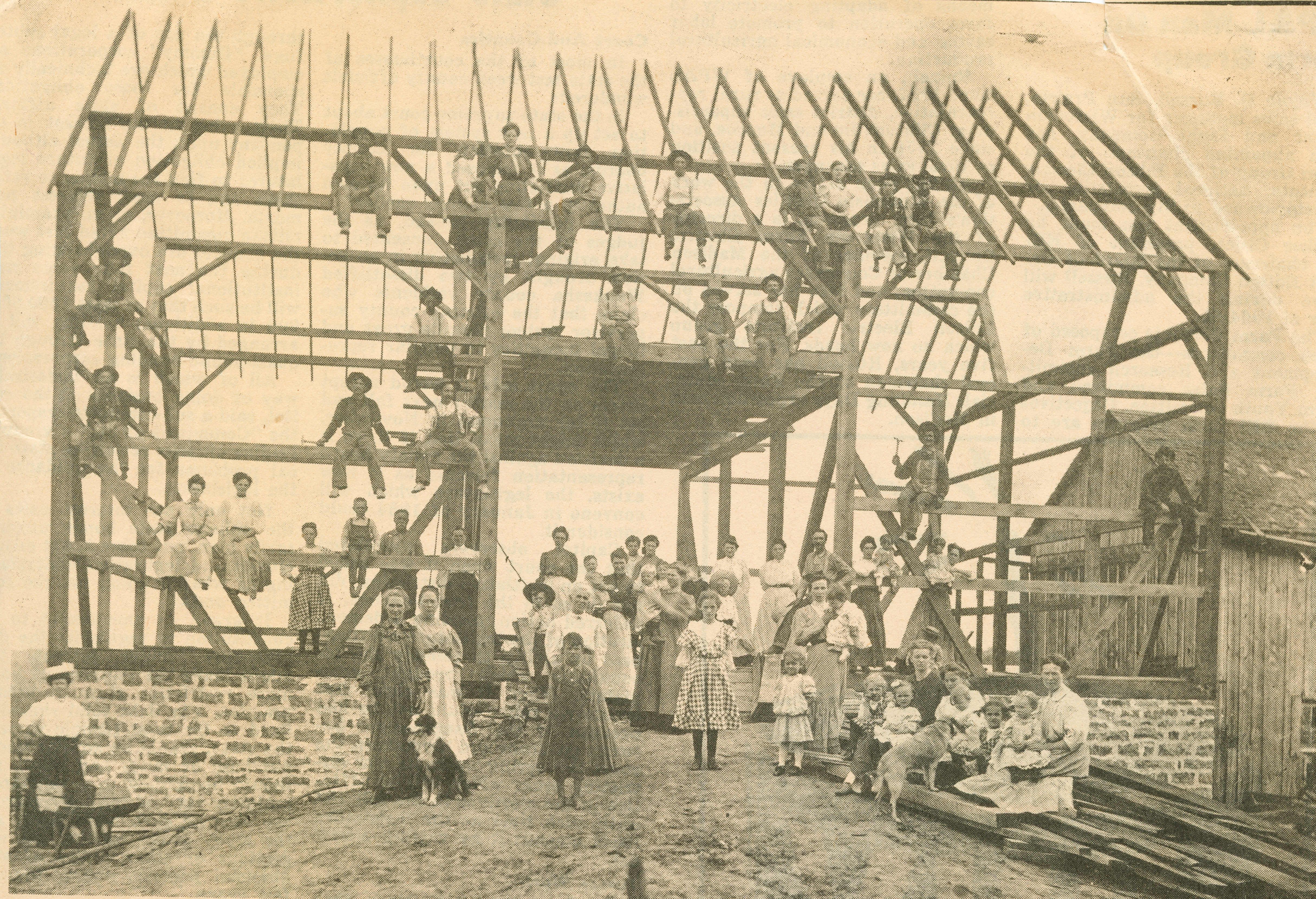 A barn raising on the Walter Zimmerman farm between Juda and Oakley Wisconsin. Pictured front row from left: Mrs. William Zimmerman, Mrs. Will Bodtorf, Herbert Mohns in front of Mrs. John Alexander, Mattie Davis Earleywine, Mrs. Bert Wunschel, Hazel Wunschel Reed, Virgil Wunschel. Sitting on lumber: Dora Wunschel Gill, Mrs. Walter Zimmerman holding Olive Zimmerman Erickson, Thelma Isaacson holding Matthew Zimmerman, Jessie Wunschel Pyle, Mrs. Myrtie Weidman holding Arvetta Weidman Smith. Second row: Ora Alexander Anderson, Ella Zimmerman Randall, Mary Davis Arnsmeier, Wesley Grenzow, Seth Bradley, Mrs. Frank Grenzow, Viron Keister, Mrs. Judd Davis, Mrs. Landow Keister holding Matthew Austin, Rose Fluckiger Pinnow, Cora Keister Meinert, Ruth Mohns Schlueter, Hattie Keister Stuckey, Mrs. Dick Rosheisen holding Ellsworth Rosheisen, Robert Mohns, Mrs. Otto Mohns, Mrs. Jenny Isaacson, Jerry Shafer, Mrs. Harry Tracy holding Requarette Tracy, Mrs. Clara Brown holding Virgil Brown. Third row: Frank Grenzow, Mr. Haas, John Zimmerman, Mr. Haas, John Alexander. Fourth row: Dick Rosheisen, Peter Weidman, Bill Zimmerman, Verne Keister, Otto Mohns. Fifth row: Judd Davis, Della Mohns, Nellie Bodtorf Kurtz, Walter Zimmerman, Bill Bodtorf, Inez Brandley Benage, Vic Zimmerman, and Unidentified.